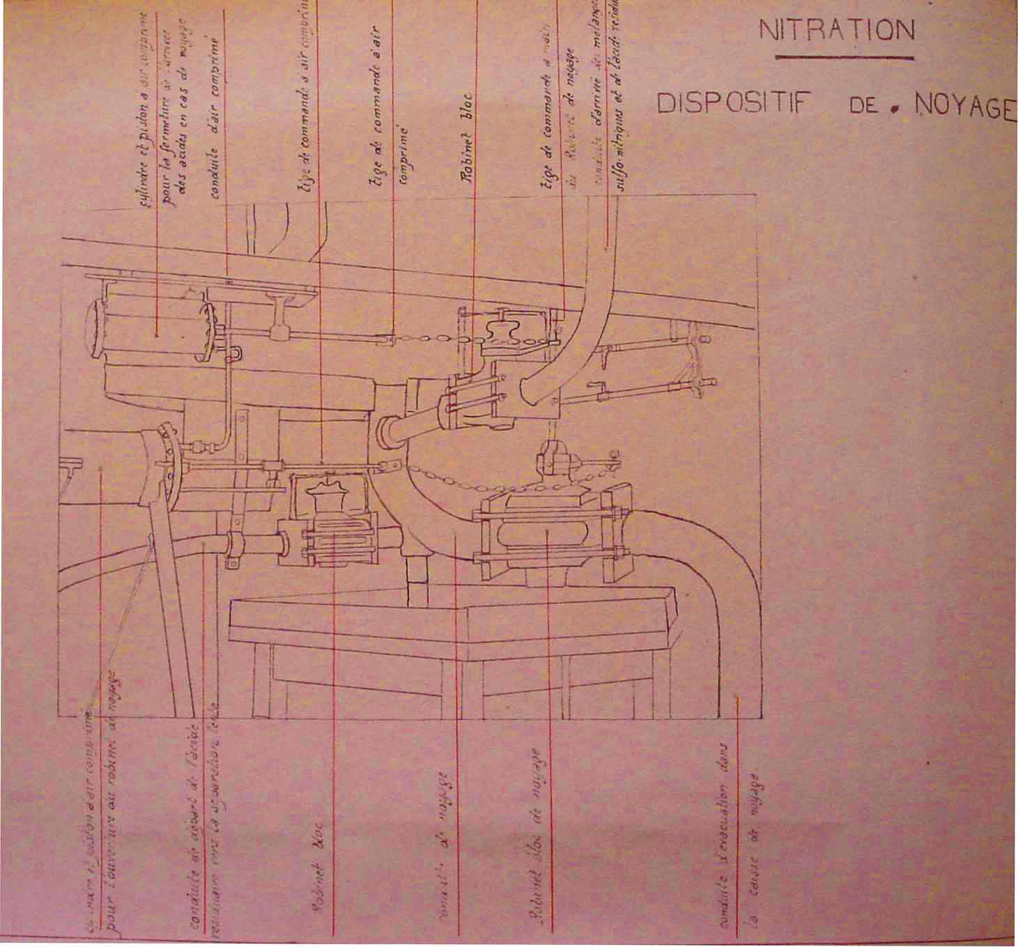 "(…) Pendant toute la durée de l'opération, les chaînes reliant aux pistons à air comprimé, le robinet de noyage et le robinet des acides résiduaires, doivent rester accrochées de façon que l'admission de l'air comprimé dans les cylindres provoque l'ouverture du robinet de noyage et la fermeture du robinet des acides résiduaires.