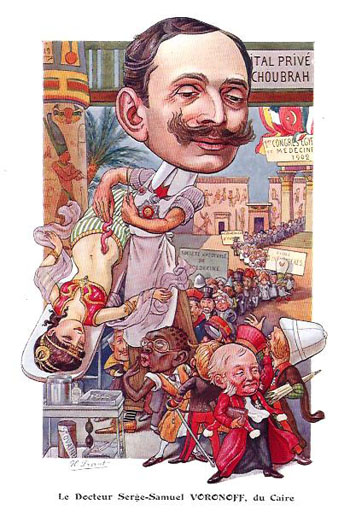 Portrait-charge de Serge Voronoff pratiquant une appendicectomie dans son hôpital de Choubrah. La patiente "esquisse une danse du ventre en l'honneur des Congressistes (Congrès de Médecine spéciale aux pays chauds, au Caire, à l'initiative du Docteur Voronoff). Professeurs et Majors étrangers viennent saluer le Maître". Chanteclair - 1910 |