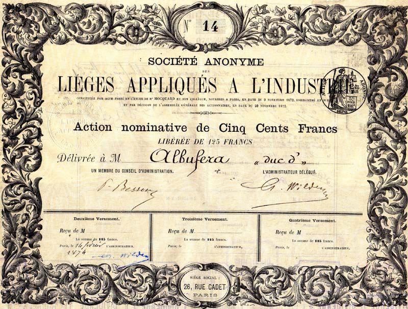Lièges appliqués à l'Industrie - Action délivrée au duc d'Albufera
