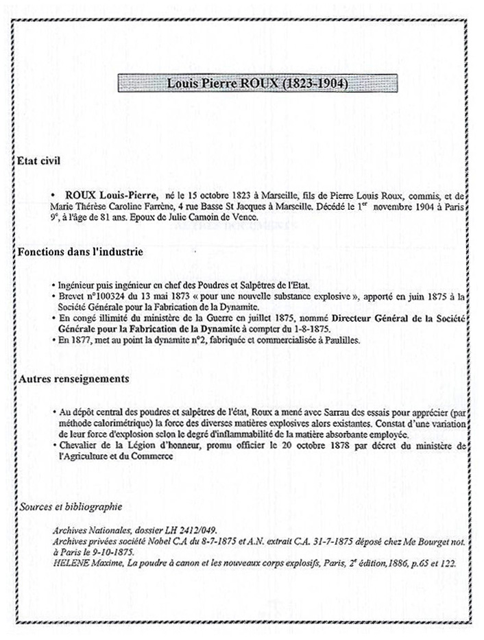Directeur de la poudrerie de St Chamas près de Marseille puis ingénieur en chef des Poudres et Salpêtres de l’Etat, Louis Roux (1823-1904) coordonne notamment, lors de la guerre de 1870, le fonctionnement des poudreries de la capitale. Il est alors connu d’Alfred Nobel qui s’adresse à lui après avoir temporairement perdu contact avec son associé, Paul Barbe, lors des combats que celui-ci mène à Toul contre l’armée prussienne.