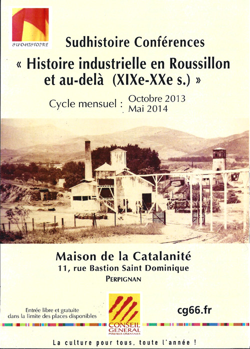 Organisé en partenariat entre le Conseil Général des Pyrénées-Orientales et l’Association Sudhistoire, ce cycle de conférences intitulé « Histoire industrielle en Roussillon » a pour objet de présenter diverses facettes de cette évolution industrielle dans ses dimensions techniques, économiques et sociales. Expansion industrielle, dynasties patronales, main-d’œuvre et rapports sociaux, aspects patrimoniaux, constituent les principaux sujets d’étude de cette année 2013-2014.