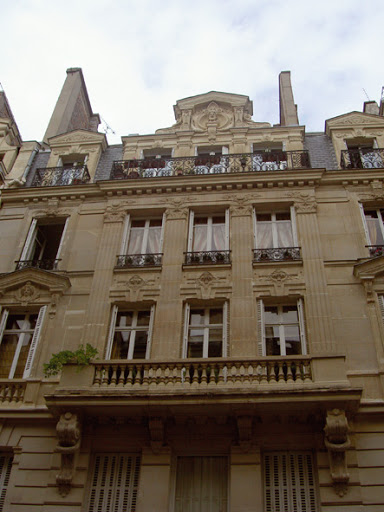 Mairie 9e arrondissement de Paris - Direction de l’urbanisme - Parcours Notre-Dame de Lorette - Nouvelle Athènes - Immeuble 8-10 rue d'Aumale (n°9 sur le plan) : "Les immeubles des 8 et 10 rue d'Aumale sont mitoyens et semblent se compléter par leur décoration. Le n° 10 a été construit en 1864 par Adrien Sibert (élève d'Henri Labrouste) avec un décor sculpté de Rouillère. Il est inscrit à l'Inventaire Supplémentaire des Monuments Historiques. Le n° 8 se distingue par le soin accordé aux trois travées centrales. La porte d'entrée est encadrée de volutes fleuries et le grand balcon est surmonté d'une imposante balustrade en pierre (au lieu de l'habituelle grille de fonte). Les pilastres corinthiens donnent à cette façade, l'aspect cossu d'un « immeuble-hôtel » qui n'a que trois étages carrés (au lieu de quatre) et dont les lucarnes en pierre de taille renvoient à l'image prestigieuse de l'hôtel particulier."