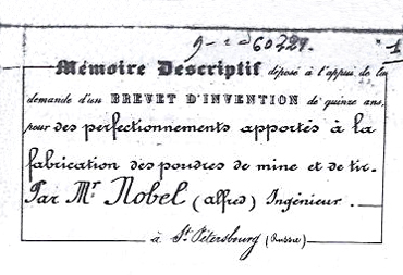 Le 18 septembre 1863, Alfred Nobel dépose à Paris une demande de brevet d’invention pour une durée de 15 ans, pour des « perfectionnements apportés à la fabrication des poudres de mine et de tir ». En préambule, l’ingénieur indique que « L’invention consiste dans l’emploi des substances explosives ou facilement décomposables, spécialement des liquides explosifs mélangés avec la poudre ordinaire… ou autres corps analogues ». Plus précisément, parmi ces liquides figure alors la nitroglycérine : « Je me sers de préférence de la nitroglycérine » indique l’inventeur, demeurant alors en Russie.