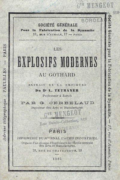 CERBELAUD G., Les explosifs modernes au Gothard. Extrait de la brochure du Dr. L. Tetmayer Professeur à Zurich, Paris, 1885, p. 19-21.