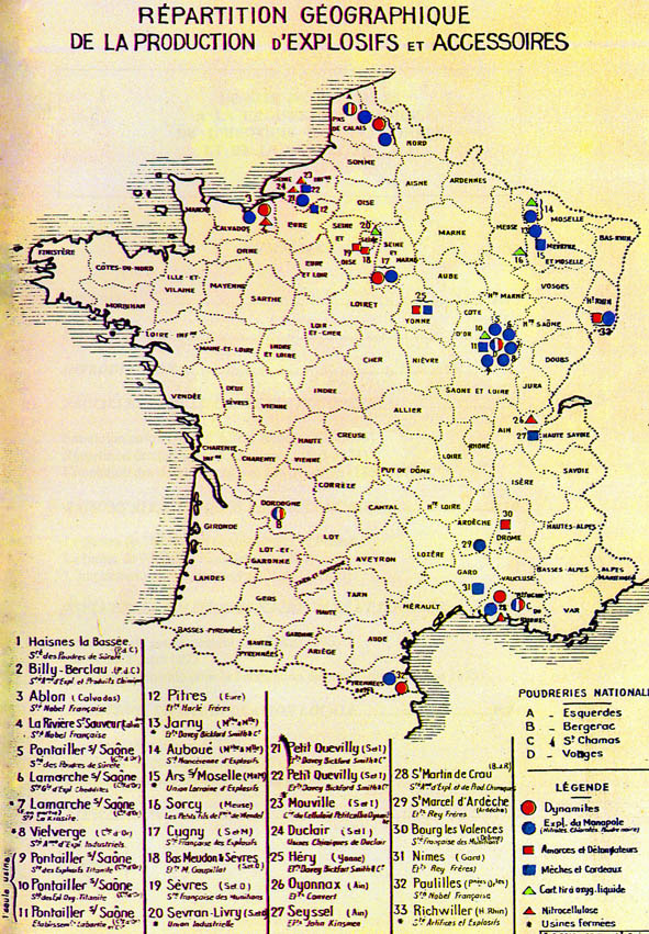 Selon une rare monographie consacrée aux explosifs, il existe en 1943 en France 51 entreprises de fabrication d'explosifs dépendant de l'industrie privée, qui disposent au total de 66 usines. A la fin de 1943, 16 entreprises possédant 29 usines sont fermées en vertu des mesures générales de concentration.
