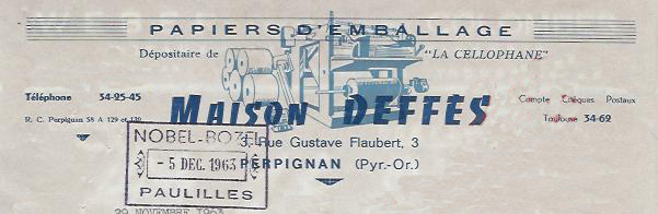 L’usine de Paulilles s’approvisionne par ailleurs en papier kraft gommé. Localement, la dynamiterie passe commande auprès de la Maison Deffès, notoirement connue à Perpignan et spécialisée dans les papiers d'emballage. Alors située dans le chef-lieu au n° 3 rue Gustave Flaubert, celle-ci est par ailleurs dépositaire de la marque « La Cellophane ». Composant une « Pellicule cellulosique », la cellophane est une marque créée par l’importante société éponyme, siégeant 110 bd Haussmann à Paris 8e. La société dispose de distributeurs officiels, tel l’entreprise Cellorex, basé à Le Chesnay en Oise et Oise. L’une et l’autre société expédient dès lors à l’usine de Paulilles des bobines de plusieurs kilomètres de métrage.