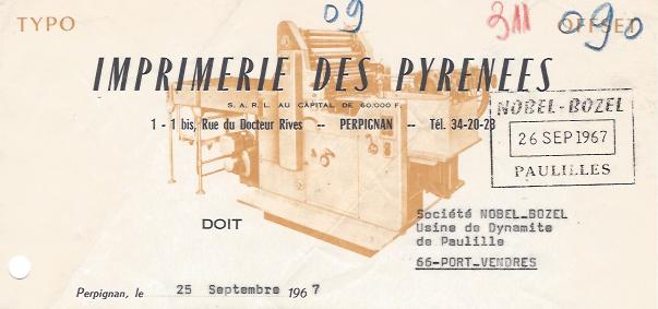Pour des besoins restant à préciser mais concernant aussi l’impression de ses étiquettes, la dynamiterie de Paulilles se sert également d’encre d’imprimerie employée in-situ. Celle-ci fait alors venir son encre des anciens établissements Ogé et Gauger, devenus la Société des Encres Ogé. Située à Malakoff, cette entreprise est spécialisée dans les encres d’imprimerie donnant des « couleurs concentrées », destinées à la « typo, litho, offset, taille douce etc ». Ainsi la dynamiterie reçoit 100 litres de « rouge oléïque 1043 » en juillet 1967.