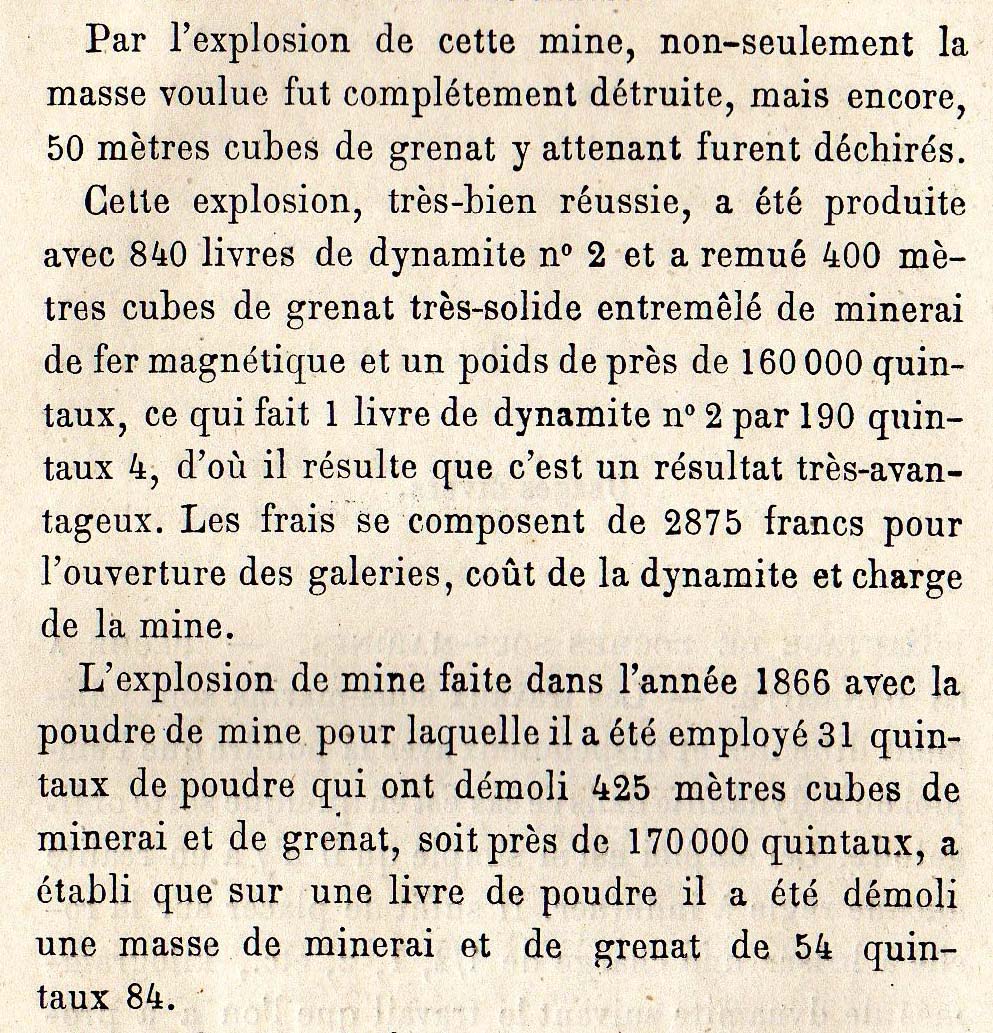 "L'explosion de mine faite dans l'année 1866 avec la poudre de mine pour laquelle il a été employé 31 quintaux de poudre qui ont démoli 425 mètres cubes de minerai et de grenat, soit près de 170 000 quintaux, a établi que sur une livre de poudre il a été démoli une masse de minerai et de grenat de 54 quintaux 84.