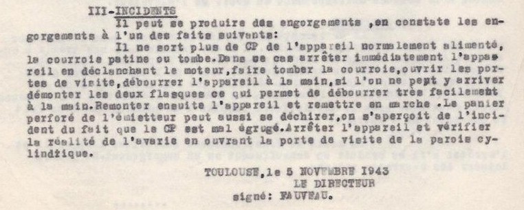 FAUVEAU, Directeur, "Poudrerie nationale de Toulouse. Instruction n°72. Emiettage du coton-poudre", Toulouse, 5-11-1943. Document dactylographié (Archives privées).