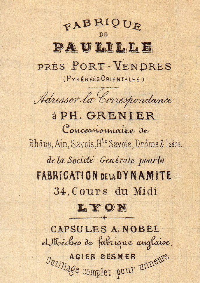 En 1876 et 1877 deux décrets autorisent le rétablissement et l’extension de la fabrique de dynamite de Paulilles, située entre Banyuls et Port-Vendres. L’une des productions de la dynamiterie est alors celle de « capsules fulminantes », c’est-à-dire de détonateurs brevetés Nobel. Ceux-ci figuraient déjà sous deux formes différentes - charge simple et charge double - à l'exposition de Lyon en 1872, par l'intermédiaire du dépositaire lyonnais des produits de la dynamiterie[1].
