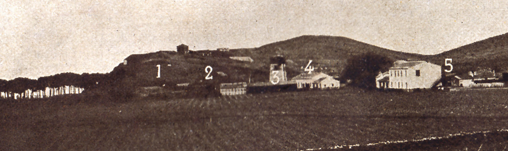 3 : château d'eau - 4 : forge, machine à vapeur, séchoirs, ateliers divers - 5 : maisons ouvrières, laboratoire.