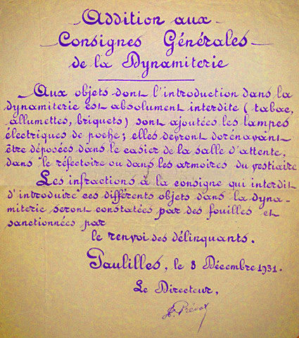 "Addition aux Consignes Générales de la Dynamiterie". Affichette signée H. Prévot, 8-12-1931. Archives privées.