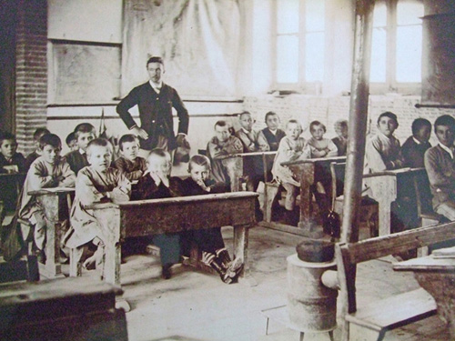 En 1887, la loi de Jules Ferry ayant rendu l’école gratuite ne date que de quelques années (1881) et l’instruction obligatoire et l’enseignement public laïque datent de 1882. Aussi, cette photographie ne présente qu’une première mise en oeuvre de cet enseignement : une classe unique rassemblant les élèves les plus jeunes et les plus âgés et nécessitant plusieurs niveaux d’apprentissage. Une classe de garçons, dans laquelle l’élément féminin apparaît encore absent.