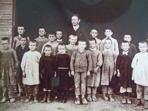 « La différence sociale par les pieds » commente le propriétaire contemporain des clichés. De fait, les jeunes enfants situés au premier plan portent soit des bottines, soit des sabots, ou ne portent pas de chaussures du tout et sont photographiés nu-pieds. Dès lors, cette première photographie de gamins scolarisés témoigne de la précarité de la condition sociale du salariat local, qu’il soit d’origine agricole ou industrielle.