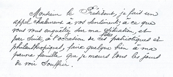 Monsieur le Président, je fais un appel chaleureux à vos sentiments ; à ce que vous enquêtiez sur ma situation, et par suite, à l'occasion de ces fêtes patriotiques et philanthropiques, faire quelque bien à ma pauvre famille que je meurs tous les jours de voir souffrir.
