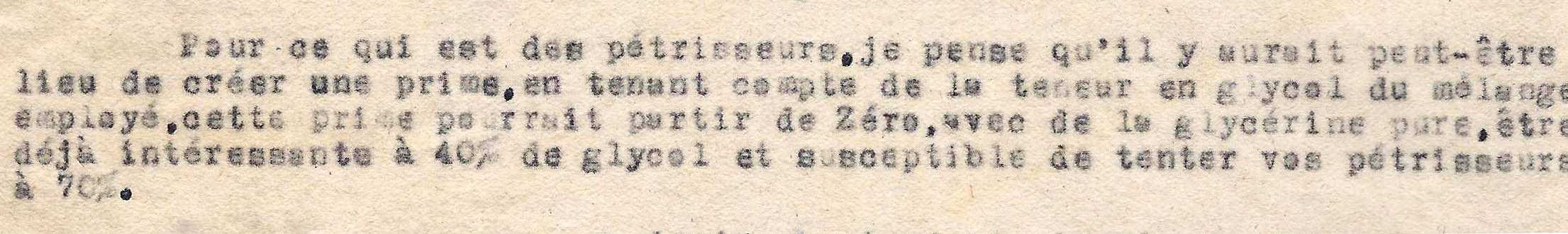 "Suite à votre note PF V1511 du 24 mai, votre télégramme du 29 mai, votre note PF V1550 du 3 juin, et votre note PF V1551 du 3 juin « J’ai lu avec le plus grand soin, toute la documentation que vous m’aviez communiquée à ce sujet, et d'après les renseignements que vous m'avez donnés, est également d'après ce que j'ai pu obtenir auprès de l'Anonyme, il semble que ce soit la forte teneur en glycol dans notre mélange glycéroglycol, qui soit la cause de toutes les difficultés rencontrées. »